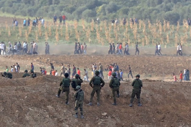 Dans la ville de Khan Younès, des témoins ont rapporté que les forces de l’occupation israélienne avaient lancé des bombes lacrymogènes et ont tiré des balles réelles contre les manifestants avant leur arrivée devant la barrière .