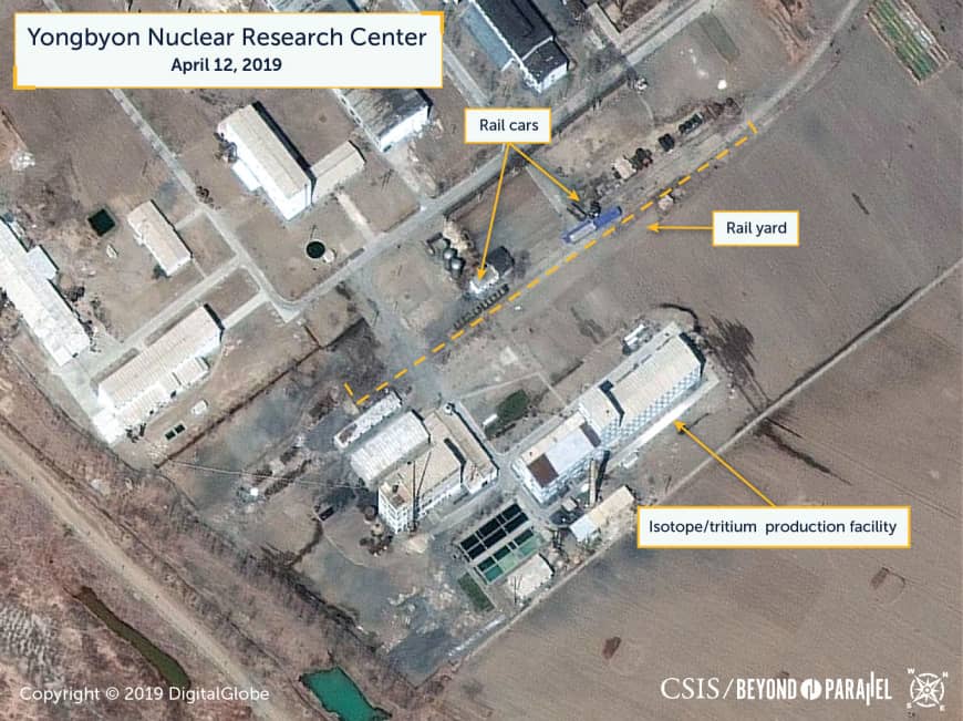 Le Centre des études stratégiques et internationales de Washington (CSIS) a indiqué que des images satellites prises le 12 avril montraient la présence de cinq wagons près de l’usine d’enrichissement d’uranium et du laboratoire de radiochimie du complexe nucléaire de Yongbyon.