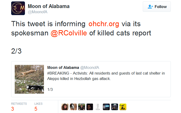 Le porte-parole du Haut-Commissariat a eu connaissance de cette nouvelle. Nous attendons maintenant le titre de la BBC: « L’ONU dit que le Hezbollah a gazé les derniers chats d’Alep ».