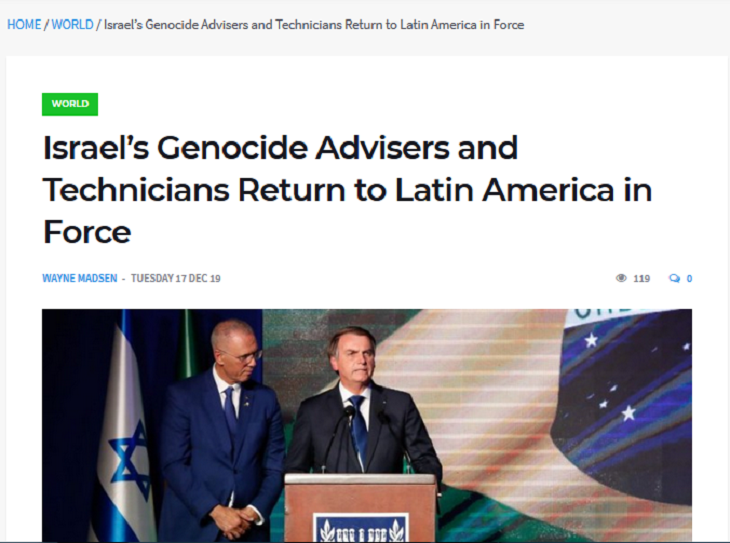 À cet égard, le journaliste américain, Wayne Madsen a écrit dans un article publié le 17 décembre, sur le site The Alt World qu’avec le renversement de gouvernements progressistes dans toute l’Amérique latine et leur remplacement par des régimes néo-fascistes de droite, les conseillers anti-insurrectionnels israéliens, mieux connus sous le nom de «marchands de la mort», sont revenus avec ferveur en Amérique latine. Des régimes fascistes au Brésil, en Bolivie, en Colombie, au Pérou, en Équateur, au Honduras, au Paraguay, au Guatemala et au Chili, désireux de déplacer les peuples autochtones, ont invité les Israéliens à retourner dans leurs pays pour fournir des conseils sur le dépeuplement des régions autochtones aussi systématiquement qu’Israël l’a fait aux Palestiniens de Cisjordanie et de Qods-est.