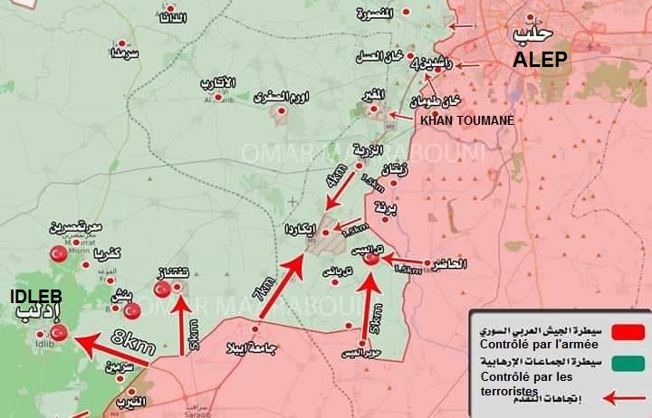 Selon l’Observatoire syrien des droits de l’homme , le pouvoir syrien contrôle désormais près de la moitié de la province d’Idleb et la quasi-totalité de la M5, à l’exception d’un tronçon d’environ 30 km, situé dans le sud-ouest d’Alep.