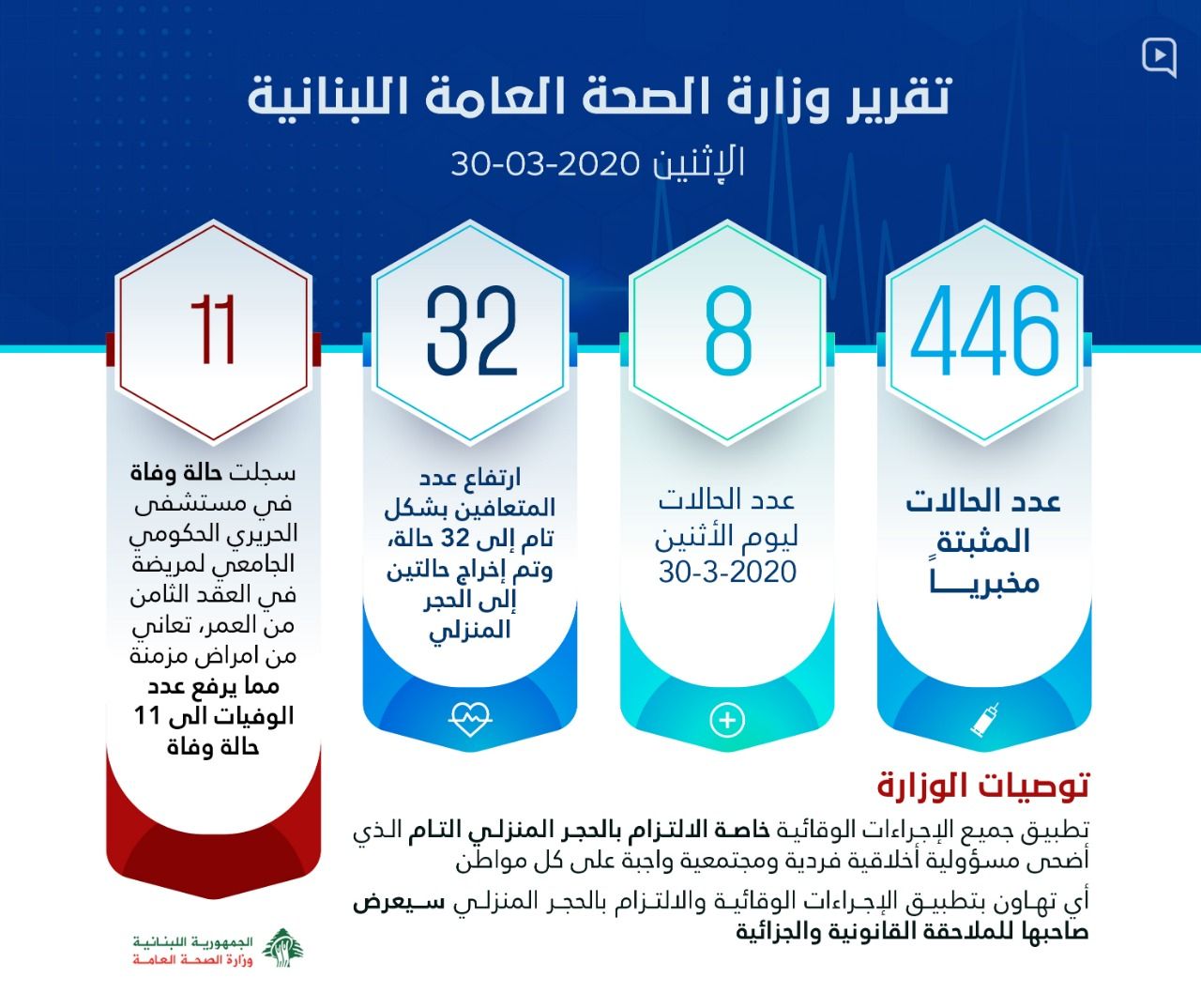 Dernier bilan du ministère de la Santé sur les chiffres de la pandémie du nouveau coronavirus (Covid-19) au Liban depuis pour le premier cas d’infection déclaré le 21 février jusqu’au lundi 30 mars à 18h00 (heure locale).