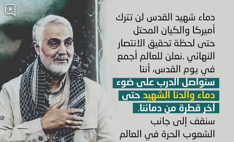 «Comme hadj Qassem a raffermi les bras des Palestiniens dans leur lutte contre l’ennemi occupant puis est parvenu à travers sa présence sur le terrain à Gaza et les autres régions du conflit avec l’entité sioniste illégitime à restructurer la résistance palestinienne, à l’organiser et l’équiper pour le présent et l’avenir, son sang ne permettra jamais que les Etats-Unis et l’entité de l’occupation réalisent la victoire finale. Nous déclarons au monde entier, en ce jour d’al-Qods que nous poursuivrons ce chemin à la lumière du sang de notre père le martyr, jusqu’à la dernière goutte de notre sang. »