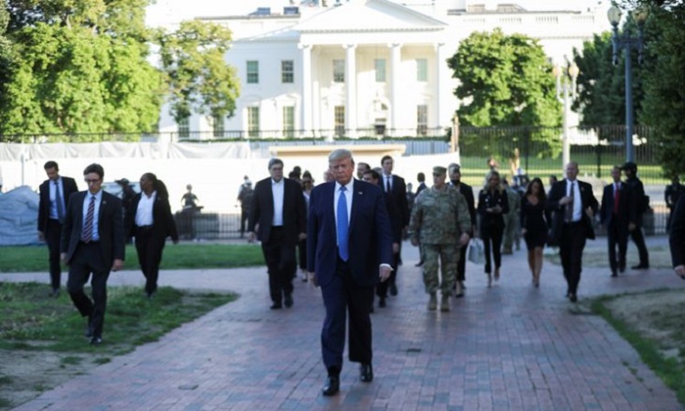 Tandis qu’il s’exprimait dans les jardins de la Maison Blanche aux airs de camp retranché, la police a effectué des tirs de gaz lacrymogène pour disperser des manifestants rassemblés à l’extérieur de l’enceinte.