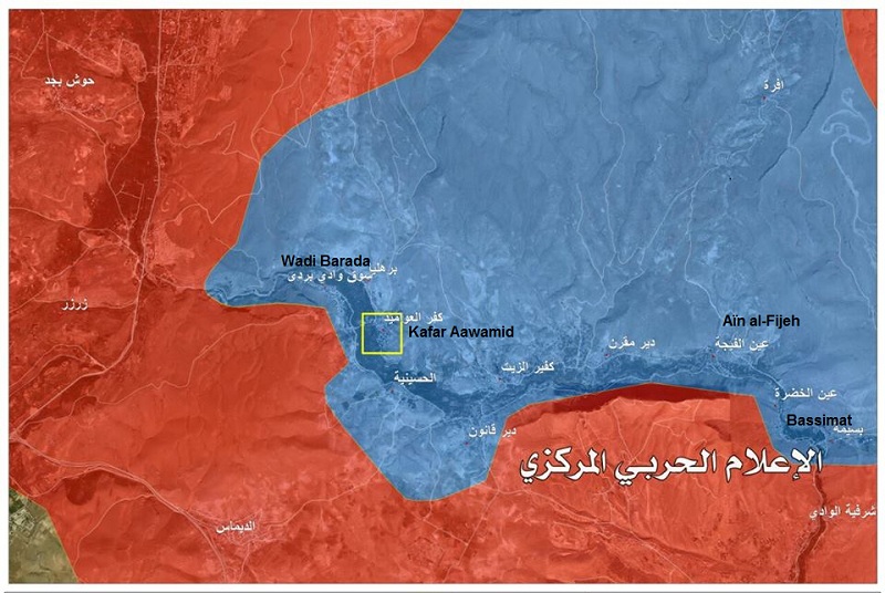Dernière évolution à Wadi Barada, région montagneuse située à 15 km à l’ouest de Damas et où des combats font rage entre l’armee syrienne et ses alliés d’un côté et le front al-Nosra est Cie de l’autre : les habitants de l’un de ses villages ont expulsé les miliciens et refusent de faire part à la bataille.