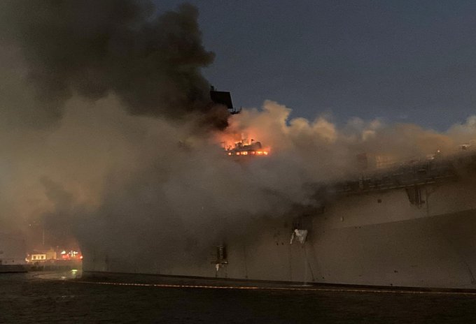 La lutte contre les flammes dure depuis près de 24 heures à bord du navire d’assaut amphibie USS Bonhomme Richard, à la base navale de San Diego, Californie, a annoncé le commandement des forces de surface de la Flotte américaine du Pacifique.