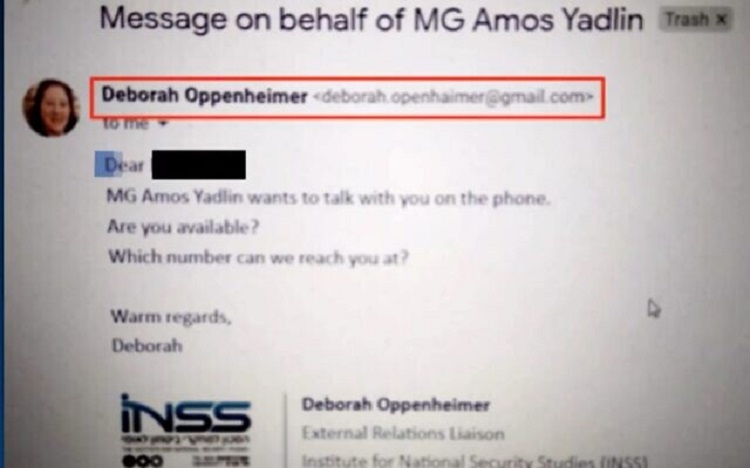 Selon le rapport, un e-mail a été envoyé le 1er novembre, apparemment à partir d’un compte Gmail appartenant à Deborah Oppenheimer, directrice des relations extérieures et secrétaire d’Amos Yadlin, chef de l’Institut israélien d’études sur la sécurité nationale (INSS) à Alma Research & Education Centre.