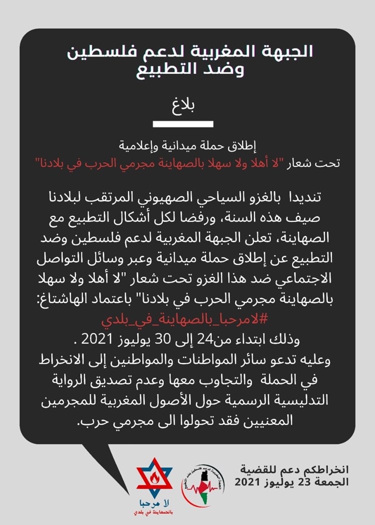 Le « Front marocain de soutien à la Palestine et de rejet à la normalisation » a appelé les citoyens marocains à participer à la campagne électronique rejetant le séjour de la délégation israélienne au Maroc, qui comprend des colons israéliens d’origine marocaine.
