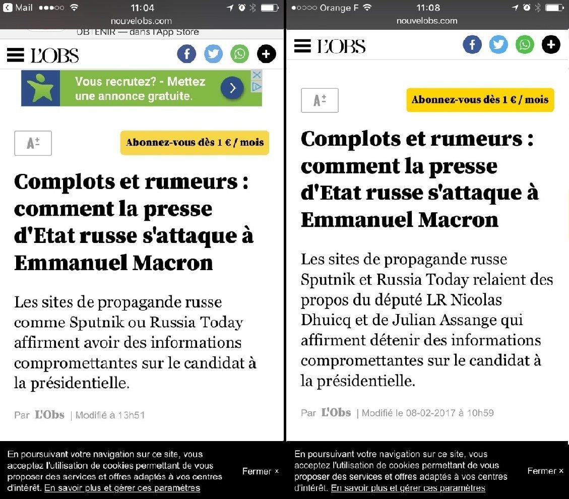 « La presse d’État russe s’attaque à Emmanuel Macron », titrait cette semaine L’Obs, accusant Sputnik de « fake news ». Une critique qui n’est pas sans soulever quelques questions. « Le site de propagande russe affirme avoir des informations compromettantes sur le candidat à la présidentielle », affichait l’en-tête de l’article en question peu après sa parution. N’en doutons pas: L’Obs n’a pas attentivement lu notre texte et n’avait aucune intention de désinformer ses lecteurs.