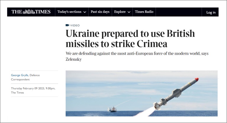 Comme le déclare le Times, la Grande-Bretagne est prête à fournir à l’Ukraine des missiles Harpoon, qui peuvent toucher une cible à 240 km et des Storm Shadow, d’une portée de 400 km. « Et comme le titre l’article sans sourciller, l’Ukraine se prépare à utiliser ces roquettes contre la Crimée, c’est-à-dire contre le territoire russe. »