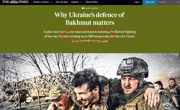 Une note de l’hebdomadaire anglais Sunday Times publiée ce dimanche 26 mars indique que l’armée ukrainienne perd jusqu’à 200 de ses combattants quotidiennement dans la bataille d’Artemovsk (Bakhmout) avec les forces russes.