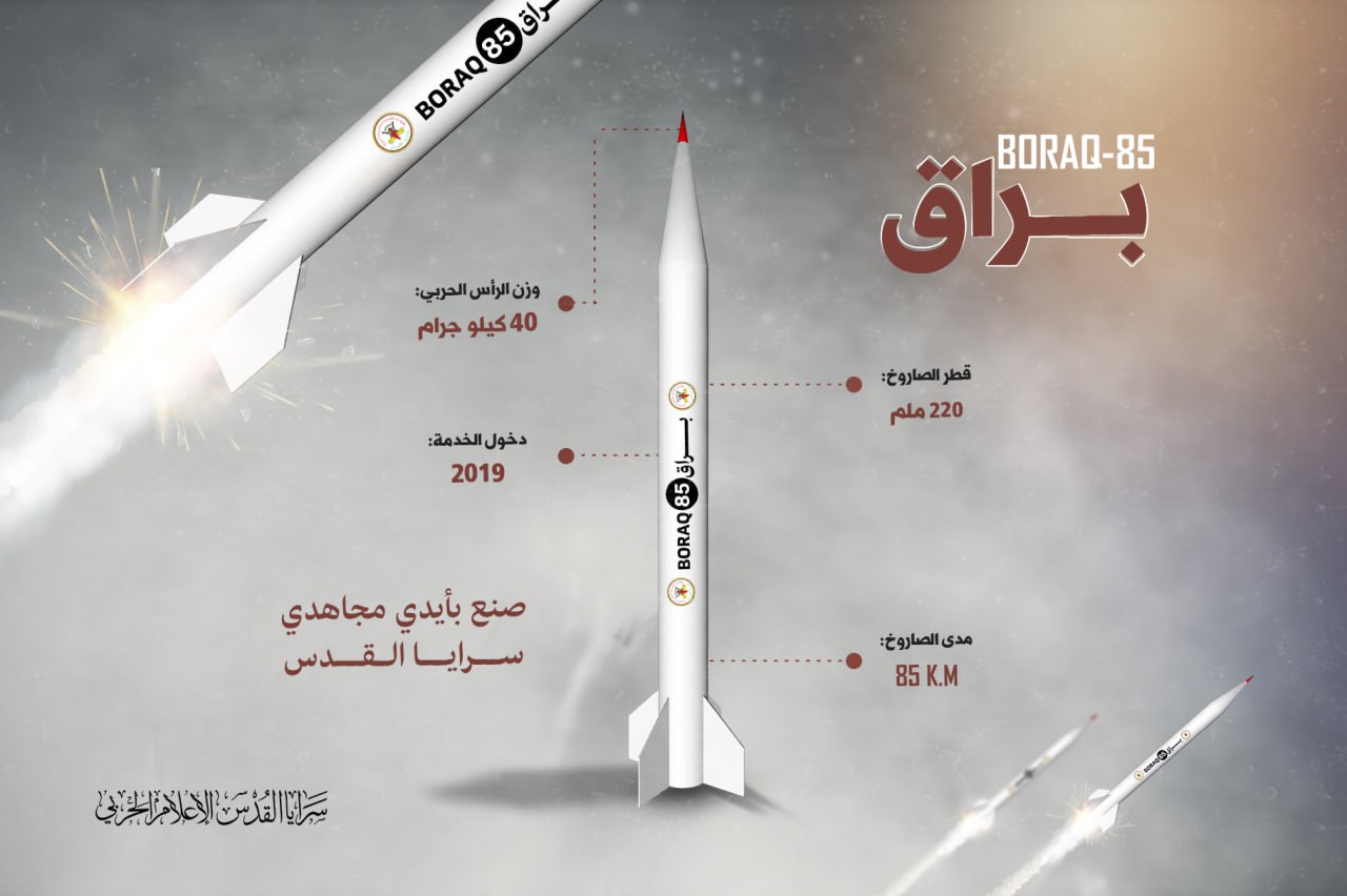 Dans la vidéo, les Brigades Al-Qods ont présenté les caractéristiques du missile Boraq-85, qui a été fabriqué par ses moudjahidines en 2019. Sa portée peut atteindre les 85 kilomètres, son diamètre est de 220 mm et le poids de son ogive peut peser 40 kg. C’est ce missile qui aurait frappé l’appartement dans Rehovot, au sud de Tel Aviv. Il n’a été intercpeté ni par Dôme de fer ni par Fronde de David, les batteries anti-missiles israéliennes.