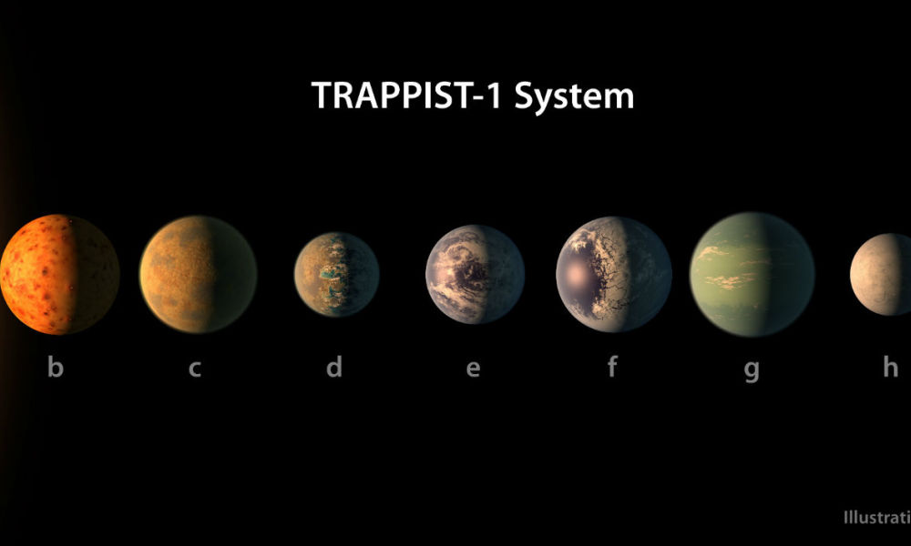 Les sept planètes, qui pourraient avoir des températures assez proches de celles de la Terre, tournent autour d’une toute petite étoile peu lumineuse et ultra-froide TRAPPIST-1 située dans notre galaxie, à « seulement » 40 années-lumière de nous.