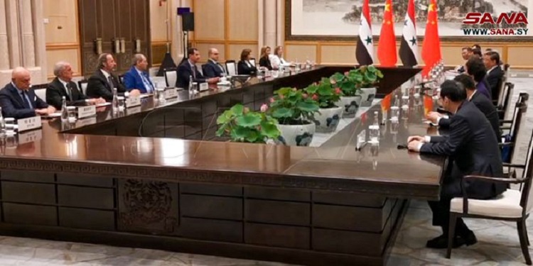 Bachar al-Assad se tenait face à lui entouré d’une délégation de neuf personnes, dans une salle ornée d’une immense fresque représentant la Grande muraille de Chine et où des drapeaux chinois et syriens étaient dressés.