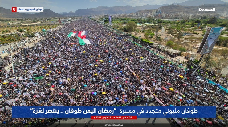 Selon la chaine yéménite al-Massira proche d’Ansarullah, il y a eu des manifestations dans la capitale ainsi que dans 15 autres provinces. Le slogan des marches de ce vendredi est « Ramadan au Yémen… Un déluge qui soutient Gaza ».