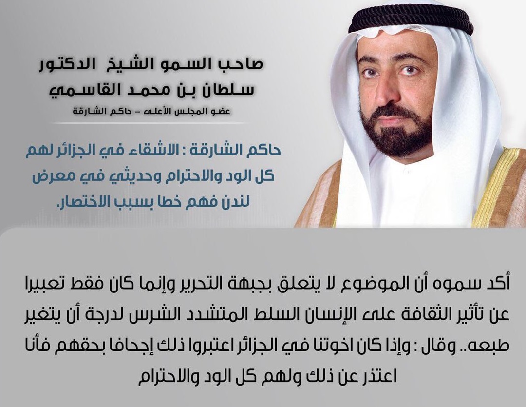 Le gouverneur émirati de Sharjah s’est excusé pour ses déclarations. Mohammed al-Qasimi, cité ce jeudi 23 mars 2017 par l’agence de presse émiratie, a présenté ses excuses au peuple algérien, affirmant que ses propos au Salon du livre de Londres sur la Guerre d’Algérie ont été mal interprétés.
