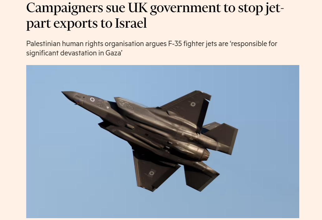 Selon le Financial Times, des activistes qui appartiennent à l’organisation des droits de l’homme palestinienne Al-Haq ont intenté une action judiciaire contre le Ministère des Affaires et du Commerce britannique. Ils l’accusent d’approvisionner l’entité sioniste en pièces essentielles pour des F-35 utilisés dans les raids israéliens meurtriers sur la bande de Gaza.