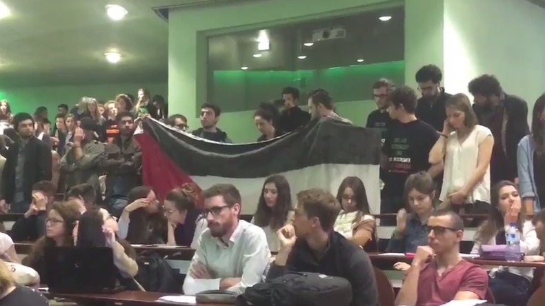 Apportant un drapeau palestinien dans l’amphithéâtre où elle devait s’exprimer, des étudiants ont pris la parole pour dénoncer la politique de colonisation israélienne des territoires palestiniens.