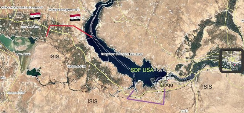 A 45 km au sud-ouest de Raqqa se trouve Tabqa, un avant-poste important pour la défense de la capitale de l’Etat islamique sur les rives de l’Euphrate. Après la libération de la ville de Dayr Hafer, l’armée syrienne a avancé vers Tabqa sur la rive sud du lac Assad situé à 40 km de la ville. Le barrage de Tabqa, situé à l’ouest de la ville, est un objectif stratégique. Il a été construit dans les années 60-70, avec le soutien de l’URSS. Il est long de de 4,5 kilomètres et fournit 35% de l’électricité en Syrie. Entre Tabqa et Raqqa, à 20 km du barrage de Tabqa, il y a un petit barrage sur l’Euphrate, appelé Baas.