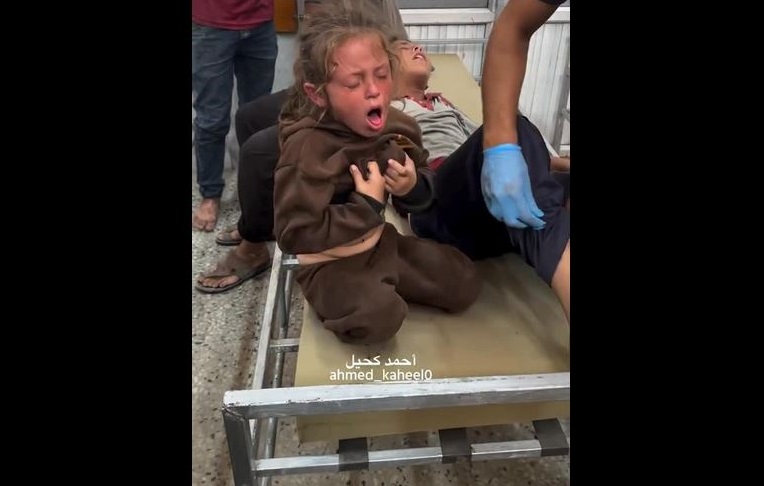 Portant sa sœur, un enfant de la bande de Gaza fond en larmes en fuyant, épuisé par le long voyage et les souffrances de la route.