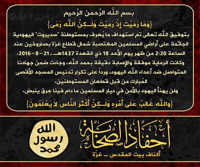 « A 10H20 le 5 octobre 2016, grâce à Dieu, la soi-disant colonie de Sederot a été visée par une roquette artisanale », a dit le groupe dans un communiqué. Selon l’iconoclastie du coomuniqué, ce groupe semble être proche d’al-Qaïda ou de Daesh.