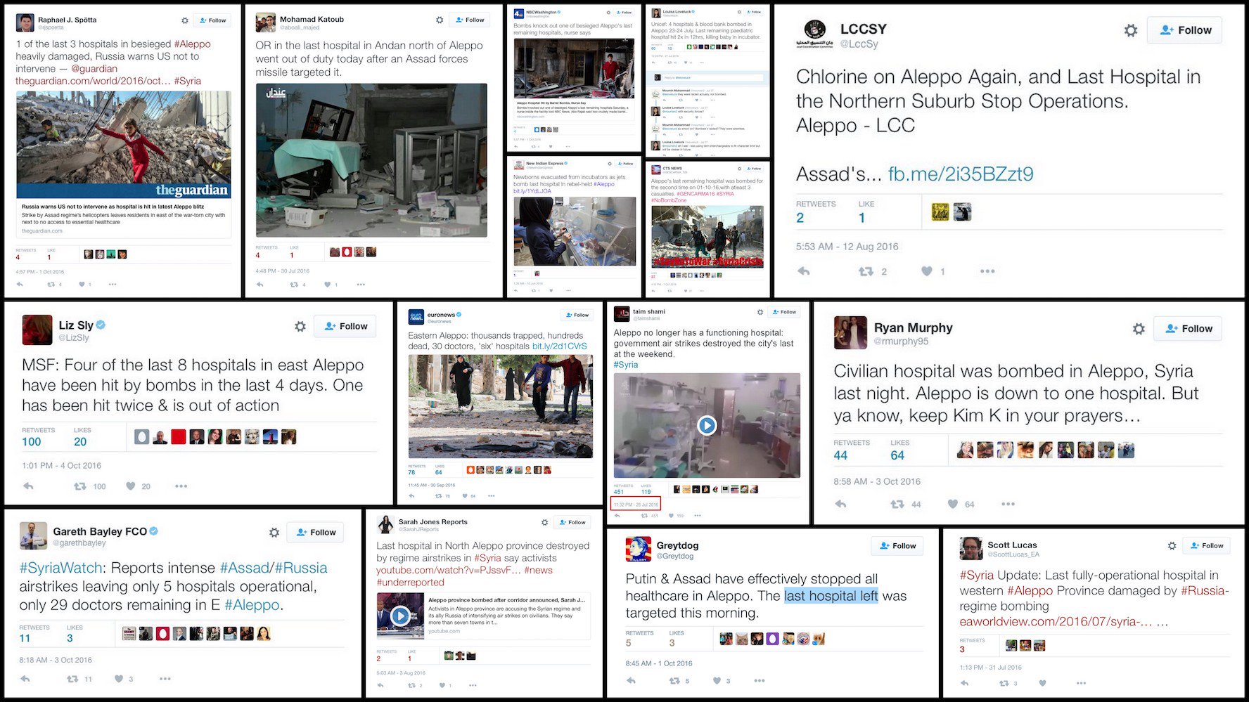 Depuis une semaine la chaine de télévision qatarie al-Jazeera avait rapporté à a la foi d’Adham Sahloul, membre de l’Association médicale syro-américaine un chiffre très diffèrent en disant « qu’il restait encore à l’est d’Alep encore 6 hôpitaux en action, et que deux avaient été bombardés ».