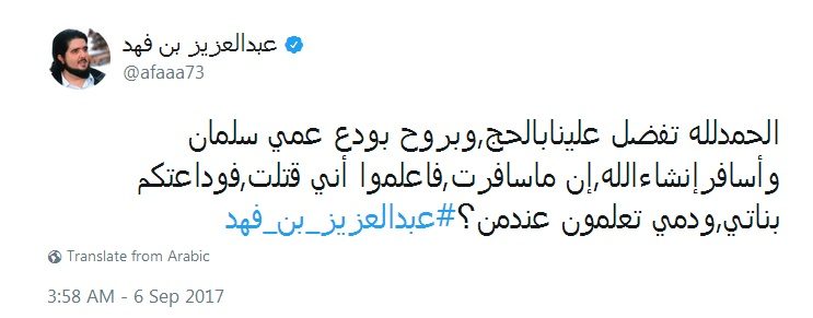 Il a écrit sur son compte Twitter: « Louange à Dieu pour avoir rempli notre devoir du Hajj. Je compte me rendre chez mon oncle Salman afin de lui faire mes adieux avant de prendre l’avion. Si je ne voyage pas, sachez que j’ai été tué . Toutes mes salutations à mes filles, quand à mon sang vous savez qui l’aurait versé… »