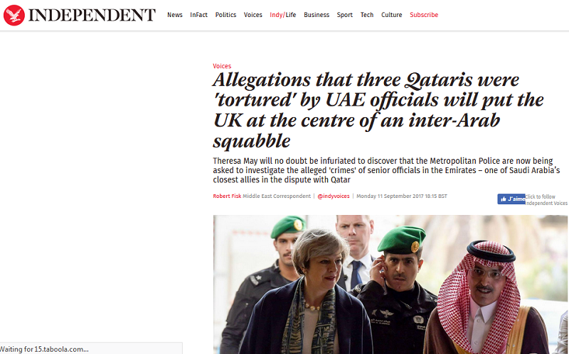 Selon M. Fisk, la Premier ministre Theresa May qui avait décidé depuis plusieurs semaines de garder secret un rapport de la Police britannique sur les sources de financement du terrorisme, pour ne pas embarrasser ses alliés saoudiens, sera sans aucun doute encore plus gênée de découvrir que sa police pourrait enquêter sur des hauts-responsables des EAU, également ses alliés.