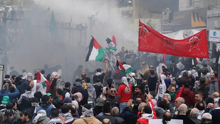 Un important rassemblement a lieu devant l’ambassade des Etats-Unis dans le quartier Awkar au nord du Liban, pour condamner la décision du président américain d’accorder Jérusalem Al-Quds à l’entité sioniste et d’y transférer l’ambassade de son pays.