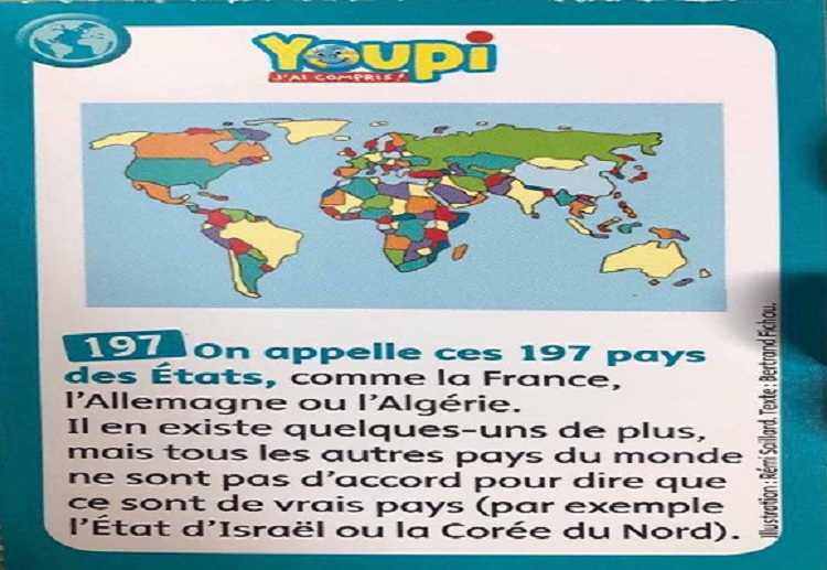«On appelle ces 197 pays des Etats, comme la France, l’Allemagne ou l’Algérie. Il en existe quelques uns de plus, mais tous les autres pays du monde ne sont pas d’accord pour dire que ce sont de vrais pays (par exemple l’Etat d’Israël ou la Corée du Nord)», expliquait la notule signée de Bertrand Fichou.