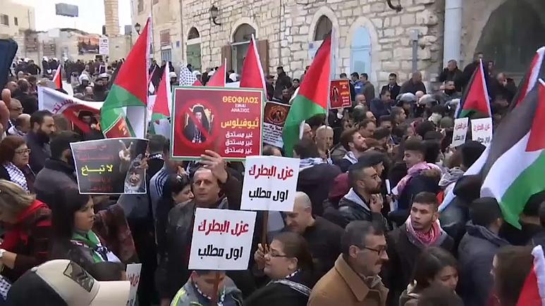Les manifestants ont tenté samedi de bloquer le convoi du Patriarche grec-orthodoxe, Théophile III de Jérusalem, qui se rendait à l’église de la Nativité à l’occasion des célébrations de Noël.