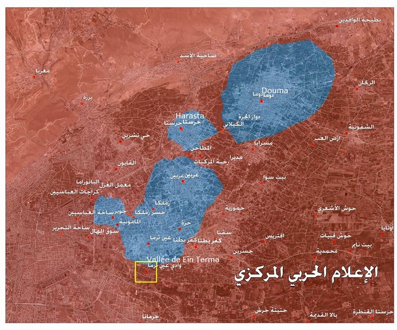 En attendant, la progression de l’armée syrienne se poursuit dans le sud. Elle a ces dernières heures conquis la vallée de Eïn Terma, comme le montre la carte ci-dessus, et 70% des fermes qui entourent la localité patronyme.